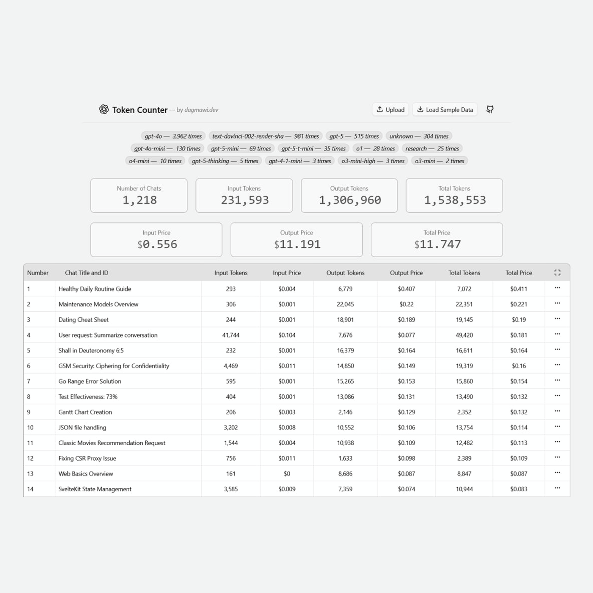 Have you ever wondered how many tokens you have given and generated within your ChatGPT chat history? Well, Token Counter is a project to help you find that out. It is an open-source and offline tool you can use to get insights into your ChatGPT chat history. It includes what models you've used, how many tokens you've inputted and generated, and the cost of it all (input/output/total price). You can also sort and see your entire chat list with insights for each.